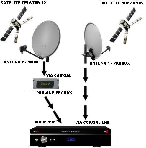 Para isso é preciso 2 antenas(mini-parabólica Off-Set), uma antena é necessária para receber as chaves dos canais (Satellite Sharing), e a outra para receber o sinal da operadora.